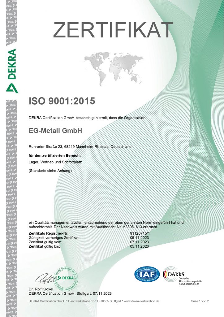 Die EG-Metall GmbH ist nach ISO 9001:2015 durch die DEKRA Certification GmbH zertifiziert. Dieses Zertifikat bestätigt, dass wir ein anerkanntes Qualitätsmanagementsystem eingeführt und aufrechterhalten, das uns befähigt, alle Prozesse im Bereich Lager, Vertrieb und Schrottplatz effizient, transparent und kundenorientiert zu steuern und kontinuierlich zu verbessern.